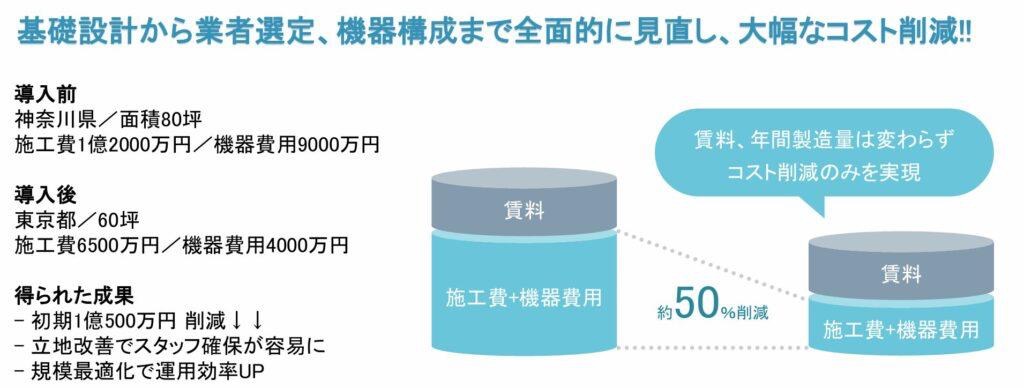 しかし、設計や機器選定を最適化することで、大幅にコストを抑えられる事例もあります。例えば、以下図のように、独立型CPCの導入計画で「2億円規模」と試算されていたものが、エリア、基礎設計、機器構成等の見直しにより、半額程度まで圧縮できたケースもあります。