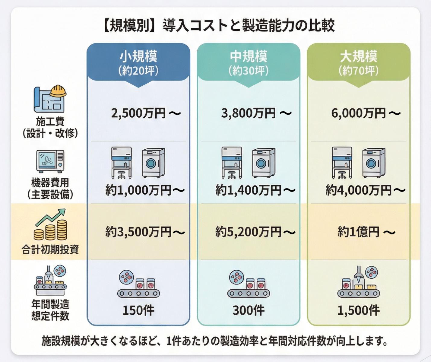 施設の規模に応じて、初期投資(施工費と機器費)は以下のように変動します。