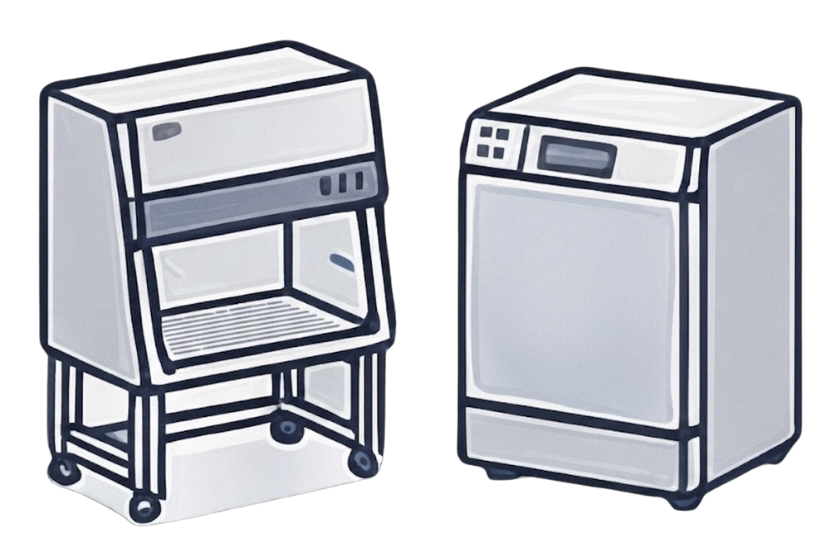 主に安全キャビネット、CO₂インキュベーター、遠心分離機などの細胞培養機器が必要です。製造内容により必要設備は変わるため、事前設計が重要になります。