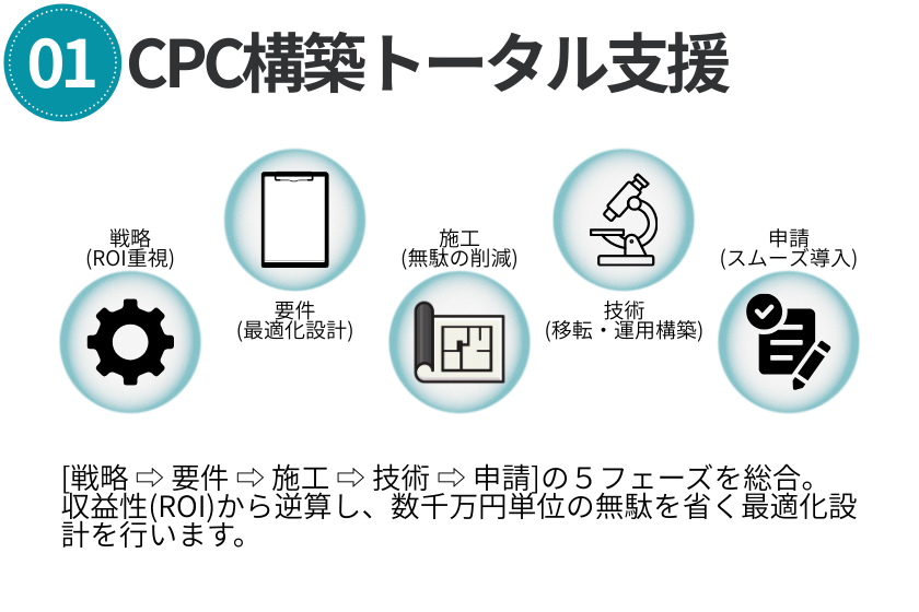 CPCの導入コストは、施設の規模・設計方針・導入機器・運用体制によって大きく変動します。小規模の併設型であれば数千万円から、中規模以上の独立型では数億円規模となることもあります。
