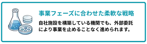 CPCの設立には、多額の初期投資と継続的な運営コストが伴います。「最初から自社で持つべきか」と悩まれるお客様も少なくありません。 当社では、事業フェーズに合わせた柔軟な戦略として、信頼できる外部培養施設(受託加工機関)への委託からスタートするプランをご提案しています。