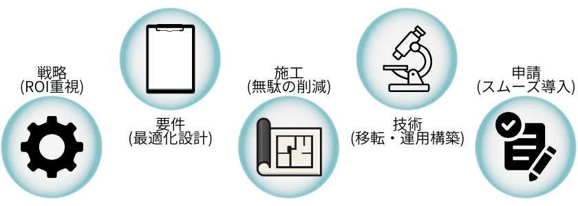 [戦略 ⇨ 要件 ⇨ 施工 ⇨ 技術 ⇨ 申請]の5フェーズを総合。収益性(ROI)から逆算し、数千万円単位の無駄を省く最適化設計を行います。