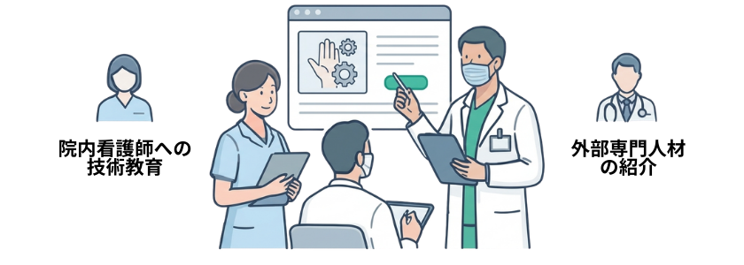 院内の看護師への技術教育や、外部の専門人材の紹介を通じて、安定的かつ確実な人材確保を支援します。