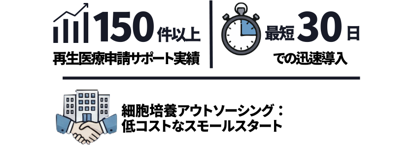 医療機関への再生医療申請サポート件数は150件以上、最短30日で導入も可能(エリアやタイミングによる)です。専門の再生医療導入コンサルタントがあらゆる再生医療の導入をサポート致します。